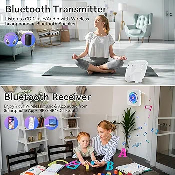 این CD Player قابل حمل شارژی مجهز به بلوتوث نسخه 5.0 بوده و هم بهعنوان گیرنده بلوتوث (پخش موزیک از گوشی روی اسپیکر دستگاه) و هم بهعنوان فرستنده بلوتوث (اتصال به هدفون یا اسپیکر بلوتوثی) عمل میکند. باتری داخلی 1800 میلیآمپری آن امکان استفاده بدون نیاز به برق مستقیم را فراهم کرده و برای استفاده در اتاق خواب، آشپزخانه، دفتر کار یا حتی پیکنیک بسیار مناسب است.