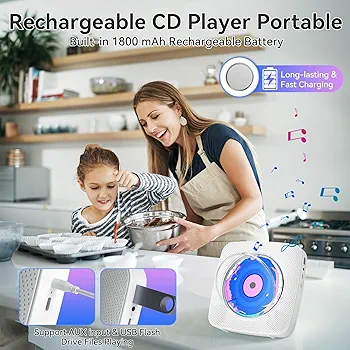 این CD Player قابل حمل شارژی مجهز به بلوتوث نسخه 5.0 بوده و هم بهعنوان گیرنده بلوتوث (پخش موزیک از گوشی روی اسپیکر دستگاه) و هم بهعنوان فرستنده بلوتوث (اتصال به هدفون یا اسپیکر بلوتوثی) عمل میکند. باتری داخلی 1800 میلیآمپری آن امکان استفاده بدون نیاز به برق مستقیم را فراهم کرده و برای استفاده در اتاق خواب، آشپزخانه، دفتر کار یا حتی پیکنیک بسیار مناسب است.