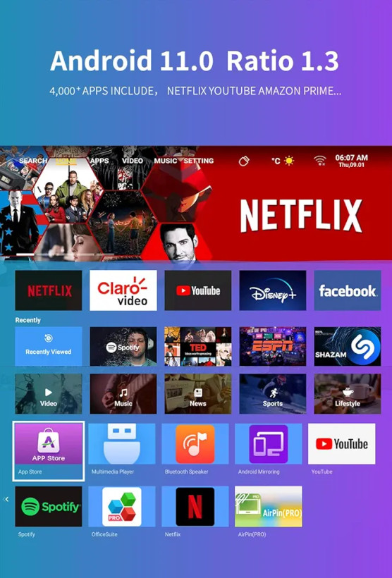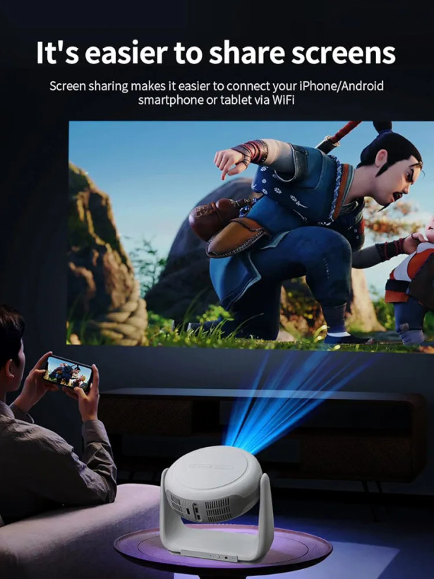Mini Smart Projector Support 4K 1080p Portable Projector یک پروژکتور هوشمند قابل حمل است که تجربه تماشای فیلم، بازی و ارائه را در خانه، سفر یا محیطهای کوچک به سطحی جدید میبرد. این دستگاه با ترکیب سیستمعامل Android داخلی، پشتیبانی از وضوح تصویر 1080p (و پشتیبانی از ویدئوهای 4K) و قابلیت اتصال بیسیم، به شما اجازه میدهد بدون نیاز به دستگاههای جانبی، تصویر بزرگ تا حدود ۱۰۰–۱۵۰ اینچ را مشاهده کنید.