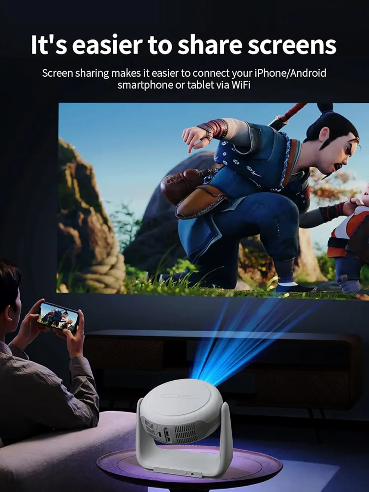 Mini Smart Projector Support 4K 1080p Portable Projector یک پروژکتور هوشمند قابل حمل است که تجربه تماشای فیلم، بازی و ارائه را در خانه، سفر یا محیطهای کوچک به سطحی جدید میبرد. این دستگاه با ترکیب سیستمعامل Android داخلی، پشتیبانی از وضوح تصویر 1080p (و پشتیبانی از ویدئوهای 4K) و قابلیت اتصال بیسیم، به شما اجازه میدهد بدون نیاز به دستگاههای جانبی، تصویر بزرگ تا حدود ۱۰۰–۱۵۰ اینچ را مشاهده کنید.