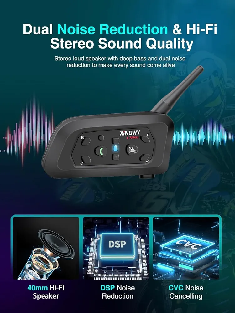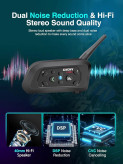 اینترکام Xinowy V6 قابلیت اتصال تا 6 نفر را دارد، اما مکالمه همزمان بین 2 نفر انجام میشود که برای استفادههای روزمره کاملاً کافی است. همچنین وجود فناوری کاهش نویز DSP باعث میشود صدای باد و محیط تا حد زیادی کاهش یافته و کیفیت مکالمه بهبود پیدا کند.