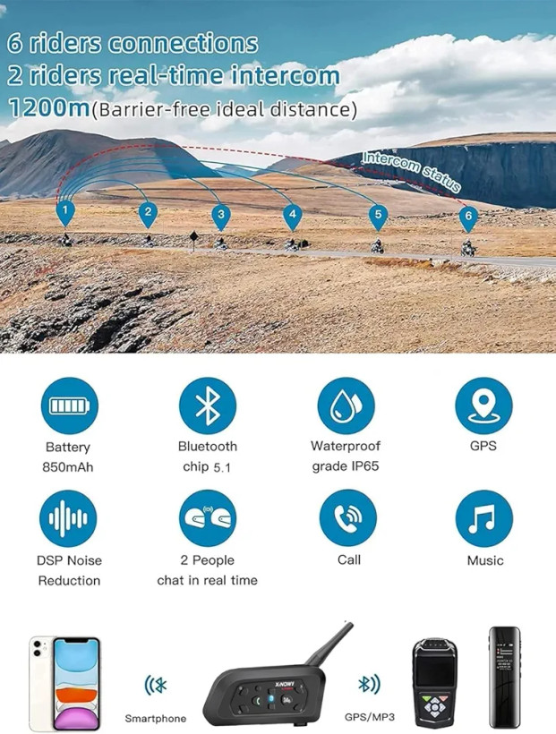 این دستگاه با بهرهگیری از بلوتوث نسخه 5.1 امکان اتصال سریع و پایدار به تلفن همراه، GPS و سایر دستگاههای بلوتوثی را فراهم کرده و به شما اجازه میدهد بدون نیاز به توقف، تماسهای خود را پاسخ دهید یا به موسیقی مورد علاقهتان گوش دهید. یکی از مهمترین ویژگیهای این محصول، برد ارتباطی تا 1200 متر است که برای ارتباط بین موتورسواران در سفرهای گروهی بسیار کاربردی خواهد بود.
