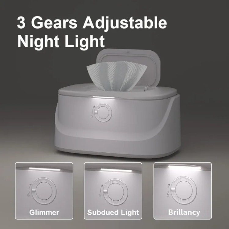 این گرمکننده دستمال مرطوب نوزاد با ۳ سطح دما (۵۰℃، ۵۵℃، ۶۰℃) و نور شب قابل تنظیم (۳ سطح روشنایی)، تجربهای آرام و بدون مزاحمت برای خواب نوزاد ایجاد میکند. مهر و موم سیلیکونی باکیفیت رطوبت را حفظ کرده و از خشک شدن دستمالها جلوگیری میکند. مکانیزم فنری نوآورانه اجازه میدهد کل بسته دستمال مرطوب اکثر برندها (بدون باز کردن بسته یا افزودن آب/اسفنج) داخل دستگاه قرار گیرد و بهراحتی دستمال بکشید.