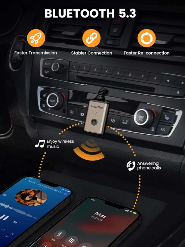 با بلوتوث ۵.۳، این آداپتور انتقال صدا را با کیفیت بالا و اتصال پایدار ارائه میدهد. شما میتوانید بدون نگرانی از قطع و وصل شدن، موسیقی، پادکست یا تماسهای تلفنی خود را از گوشی، تبلت یا لپتاپ به سیستم صوتی منتقل کنید. میکروفون داخلی نیز امکان مکالمهی دست آزاد را فراهم میکند، بنابراین در حین رانندگی یا فعالیتهای روزمره بدون نیاز به دست زدن به گوشی، تماسهایتان را مدیریت خواهید کرد.