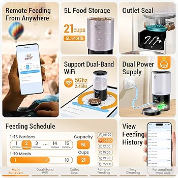 Frienhund 5G Wi‑Fi Automatic Cat Feeder یک فیدر هوشمند اتوماتیک برای گربه و حیوانات کوچک است که با استفاده از تکنولوژی وای-فای دو بانده (2.4 GHz + 5 GHz) و کنترل از طریق اپلیکیشن، زندگی شما و حیوان خانگیتان را سادهتر و امنتر میکند. این دستگاه مناسب کسانی است که شاغل، مسافر یا دوست دارند کنترل کاملی روی رژیم غذایی گربه یا سگ کوچکشان داشته باشند بدون نیاز به حضور فیزیکی دائم.