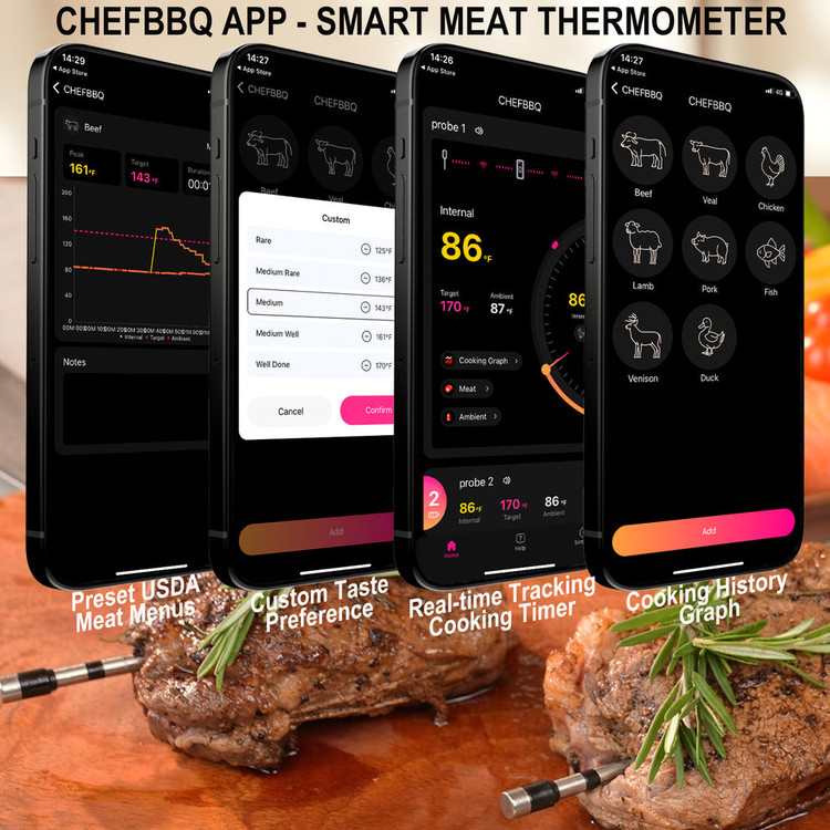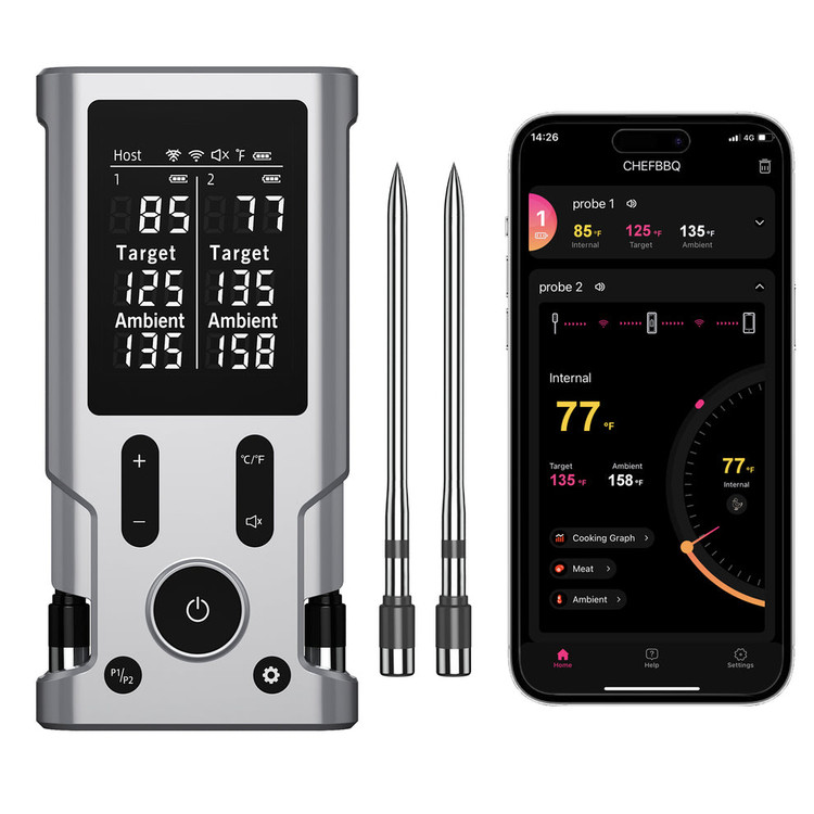 اپلیکیشن اختصاصی دستگاه امکان تنظیم دمای هدف، انتخاب نوع گوشت و دریافت هشدار هوشمند هنگام رسیدن به دمای مطلوب را فراهم میکند. بنابراین دیگر نگران خشک شدن گوشت یا نیمپز ماندن آن نخواهید بود. طراحی کاملاً بیسیم پروبها نیز آزادی عمل بیشتری هنگام بستن درب گریل یا اسموکر فراهم میکند.