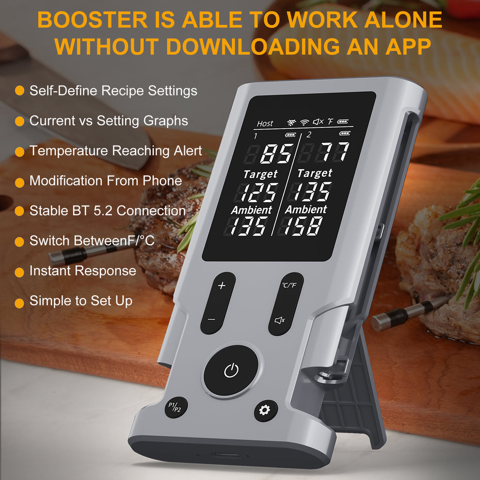 اپلیکیشن اختصاصی دستگاه امکان تنظیم دمای هدف، انتخاب نوع گوشت و دریافت هشدار هوشمند هنگام رسیدن به دمای مطلوب را فراهم میکند. بنابراین دیگر نگران خشک شدن گوشت یا نیمپز ماندن آن نخواهید بود. طراحی کاملاً بیسیم پروبها نیز آزادی عمل بیشتری هنگام بستن درب گریل یا اسموکر فراهم میکند.