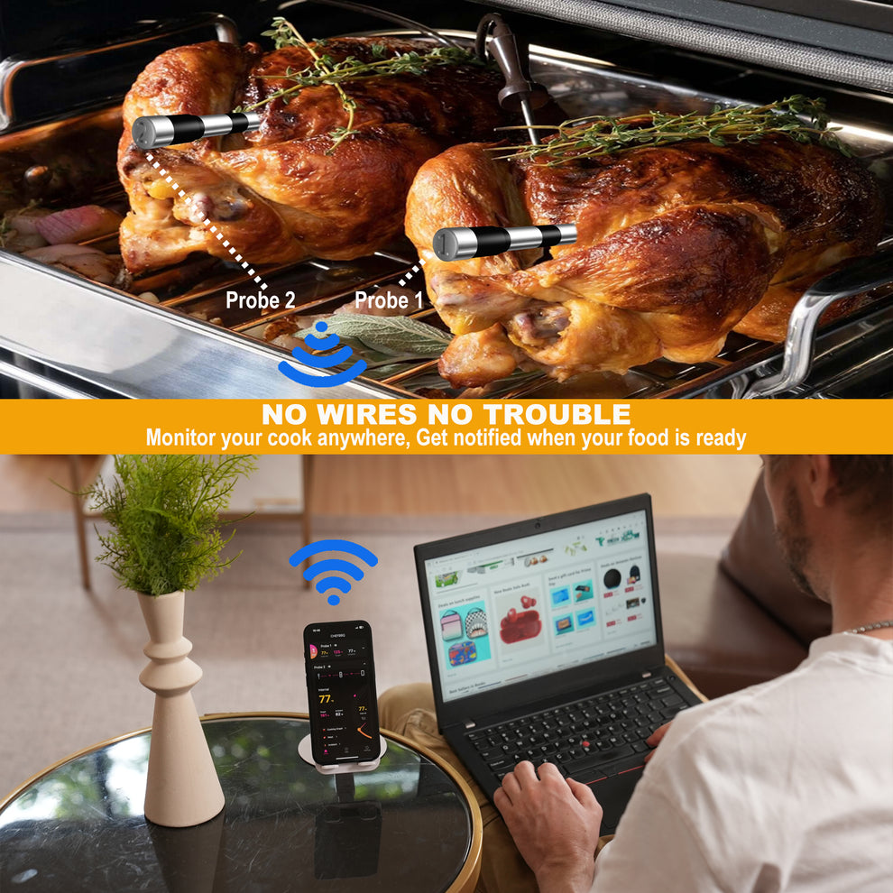 اگر به دنبال یک دماسنج هوشمند بیسیم گوشت با برد بالا برای گریل، باربیکیو یا اسموکر هستید، مدل 800FT Smart Wireless Meat Thermometer یکی از بهترین انتخابهای حرفهای بازار است. این دماسنج دیجیتال بلوتوثی مخصوص باربیکیو با برد فوقالعاده تا ۸۰۰ فوت (حدود ۲۴۰ متر) به شما اجازه میدهد بدون نیاز به ایستادن کنار گریل، دمای داخلی گوشت و دمای محیط پخت را مستقیماً از طریق اپلیکیشن موبایل کنترل کنید.