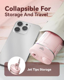 مخزن آب تلسکوپی این واترجت شارژی مسافرتی فضای کمی اشغال میکند و پس از باز شدن، ظرفیت کافی برای یک شستشوی کامل دهان را در اختیار شما قرار میدهد. وجود چند حالت تنظیم فشار (ملایم، نرمال، قوی و پالسی) باعث میشود افراد با لثههای حساس، ارتودنسی، ایمپلنت یا روکش دندان نیز بتوانند با خیال راحت از آن استفاده کنند.