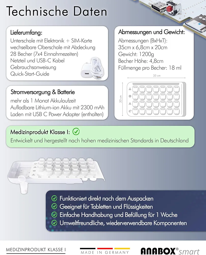 آیا به دنبال یک راهکار حرفهای، هوشمند و قابل اعتماد برای یادآوری، سازماندهی و مدیریت مصرف داروها هستید؟ ANABOX Smart Digital Health Assistant یک دستگاه نوآورانه است که ترکیبی از فناوری هوشمند و طراحی کاربرپسند را برای مراقبت بهتر از سلامت شما فراهم میکند. این محصول مخصوص افرادی طراحی شده که نیاز به کنترل دقیق مصرف داروها، برنامهریزی دارویی هفتروزه، و یادآوری به موقع دارند.