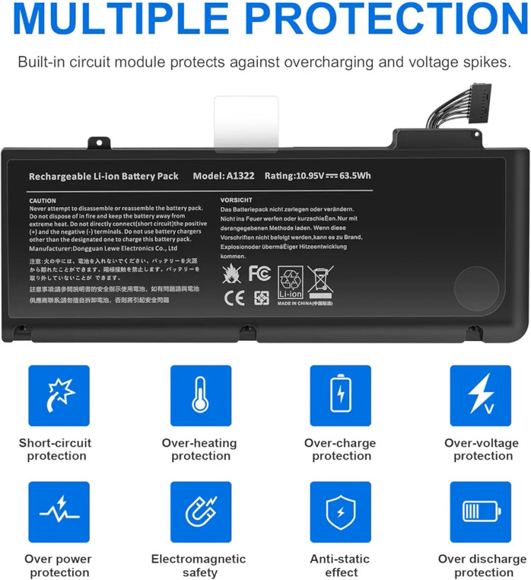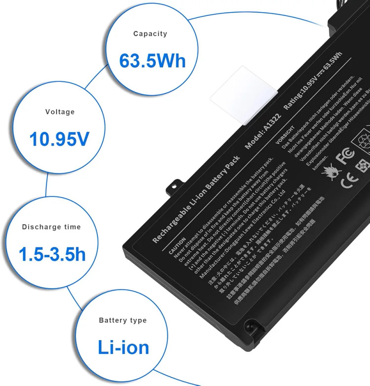 باتری A1322 با ولتاژ استاندارد 10.95 ولت و ظرفیت حدود 63.5 واتساعت طراحی شده و کاملاً مطابق با مشخصات فنی باتری اورجینال اپل ساخته میشود. این محصول مناسب مدلهای MacBook Pro 13″ A1278 بین سالهای 2009 تا 2012 بوده و با پارتنامبرهای اصلی اپل مانند 661-5229 و 020-6547-A سازگار است.