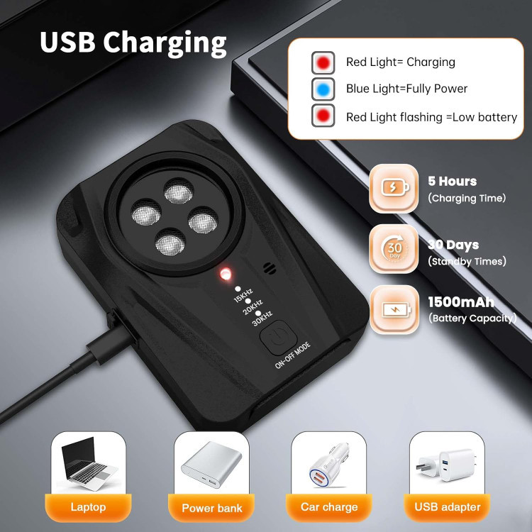 این مدل مجهز به 4 فرستنده قدرتمند اولتراسونیک است که پوششدهی وسیعتر و تأثیرگذاری بیشتری نسبت به مدلهای معمولی دارد. با طراحی قابل شارژ و باتری داخلی قدرتمند، دیگر نیازی به تعویض مداوم باتری نخواهید داشت. این دستگاه هم برای استفاده داخل منزل و هم در فضای باز مناسب است و میتواند در شعاع قابل توجهی عمل کند.