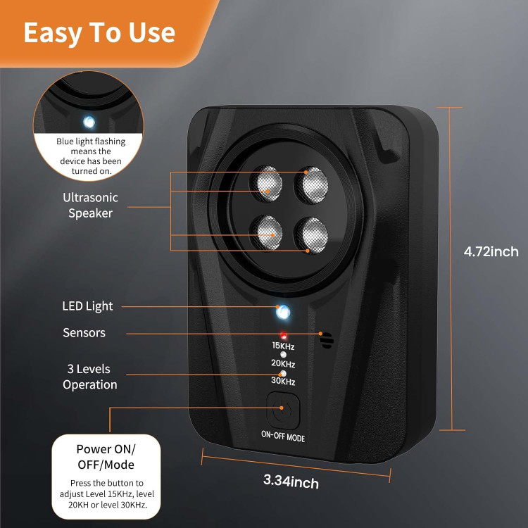 این مدل مجهز به 4 فرستنده قدرتمند اولتراسونیک است که پوششدهی وسیعتر و تأثیرگذاری بیشتری نسبت به مدلهای معمولی دارد. با طراحی قابل شارژ و باتری داخلی قدرتمند، دیگر نیازی به تعویض مداوم باتری نخواهید داشت. این دستگاه هم برای استفاده داخل منزل و هم در فضای باز مناسب است و میتواند در شعاع قابل توجهی عمل کند.